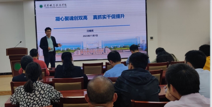 德赢AC米兰官网行政负责人汪耀武传达学习学校近期重要会议精神,并结合主题教育学习给全院教职工上了生动的一课,从学院存在问题与面临机遇、总体发展思路、发展具体措施、工作要求等四个方面对学院的现状与未来一段时期的工作作了分析和总体部署。他指出,我们要走特色发展之路,紧紧围绕服务学校双高建设,以质量求生存,以创新谋发展,在重点领域争取突破、打造品牌。
