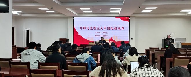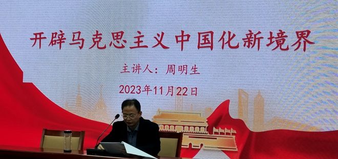 为深入推进学习贯彻习近平新时代中国特色社会主义思想主题教育走深走实,不断引领带动党员、干部以学铸魂、以学增智、以学正风、以学促干,推动主题教育入脑入心入行。11月22日,德赢vwin官方入口副校长周明生以《开辟马克思主义中国化时代化新境界》为题,结合自身学习党的创新理论的思考体会和实际工作,在建筑楼211为德赢AC米兰官网全体教职工讲授了一堂主题教育专题思政课。德赢AC米兰官网党总支书记曾学礼主持。